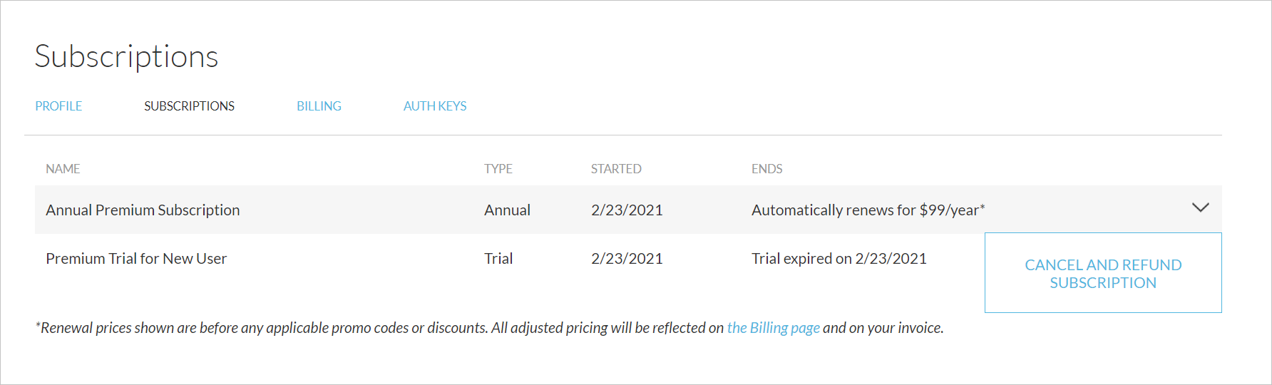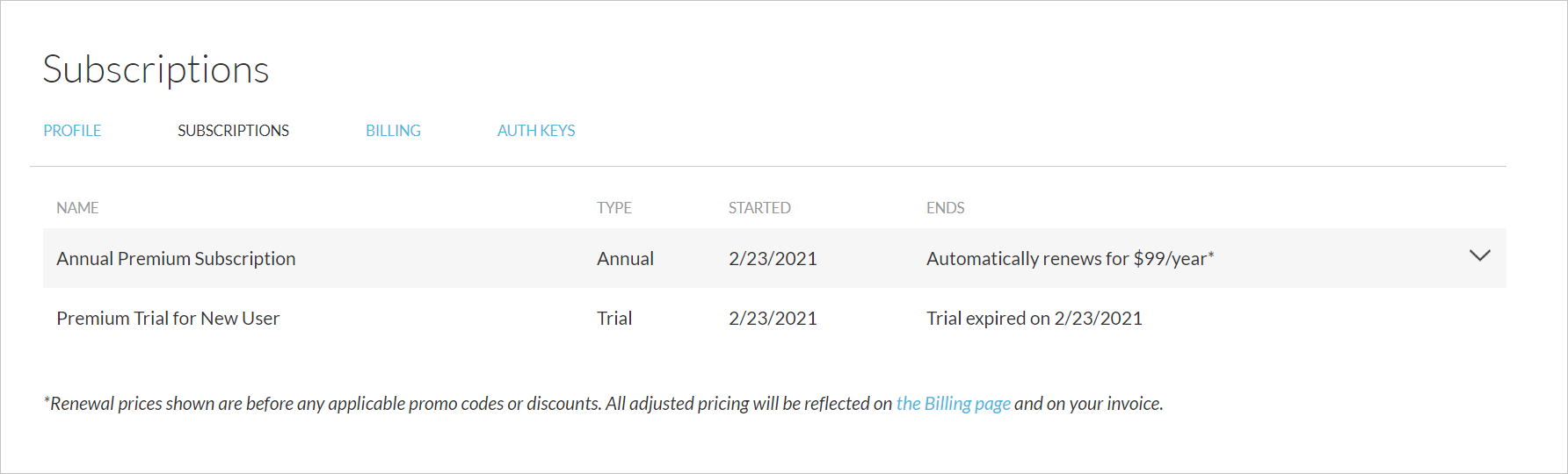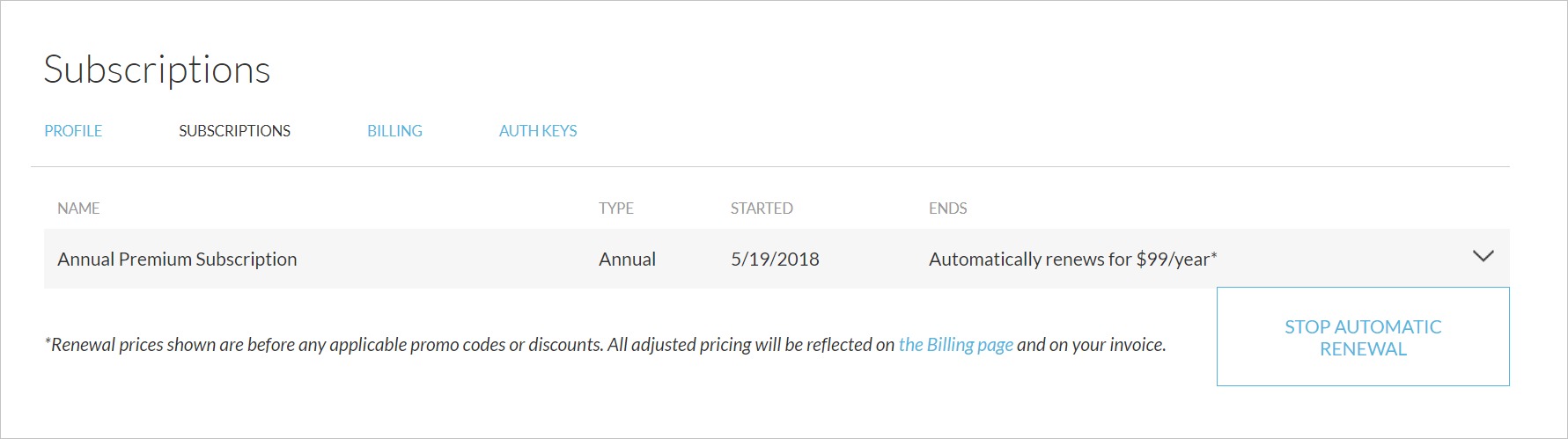 To view your existing subscriptions, go to your subscription page. Subscriptions will automatically renew at the end of the period unless you cancel the subscription by stopping the automatic renewal. Note that the subscription renewal prices listed reflect the base price of a subscription without any applicable discounts. Your individual billing invoices in your Billing View will include any discounts.Billing View
